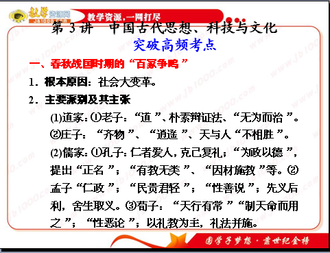 2011届高三历史二轮复习课件:专题一 第3讲 中国古代思想、科技与文化(新课标)