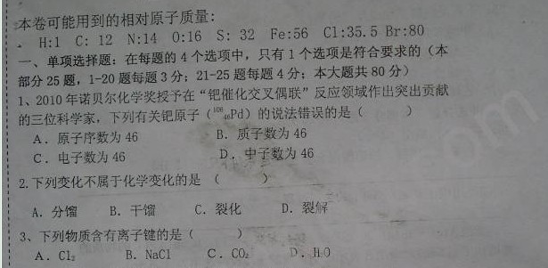 江苏省淮安市盱眙中学10-11学年高一下学期学情调研考试(化学)扫描版