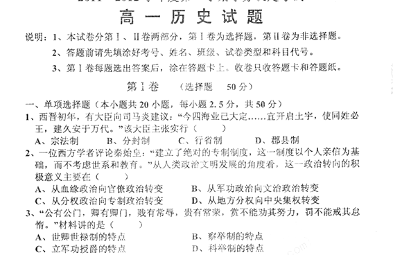 山东省嘉祥县一中11-12学年高一上学期学分认定考试(历史)扫描版