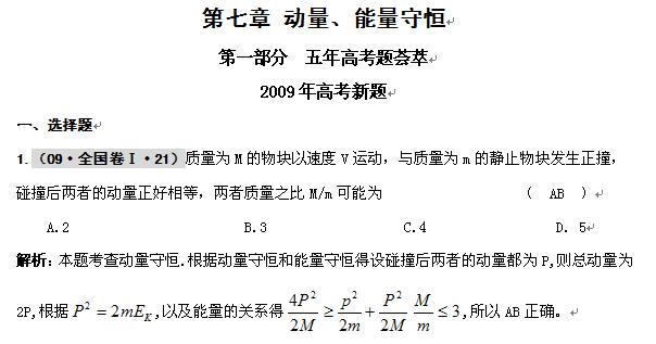 物理:2010届高考复习五三精品题库:第七章 动量、能量守恒