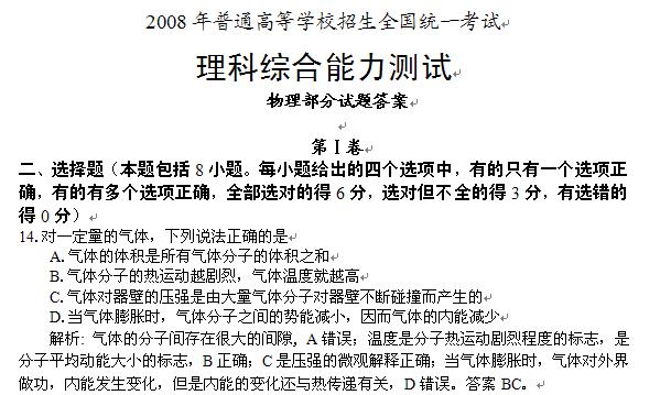 甘肃省2008年高考全国Ⅱ理综(物理部分逐题解析)