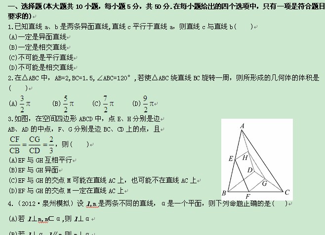 【金榜原创】2014年高考一轮复习考点热身训练:第七章 立体几何(单元总结与测试)
