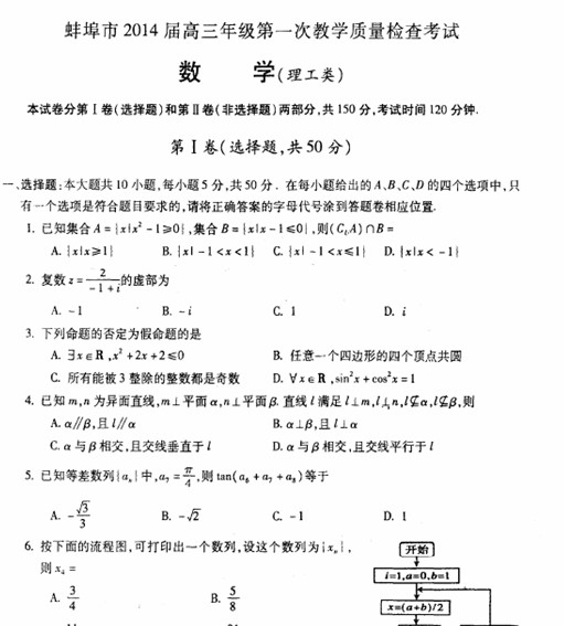安徽省蚌埠市2014届高三第一次质量检测(数学理)扫描版