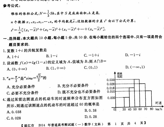 (2014湛江一模)广东省湛江市2014届高三高考测试(一)(数学文)扫描版