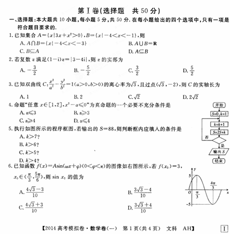 安徽省2014届高考模拟信息考试 (数学文)(一)扫描版