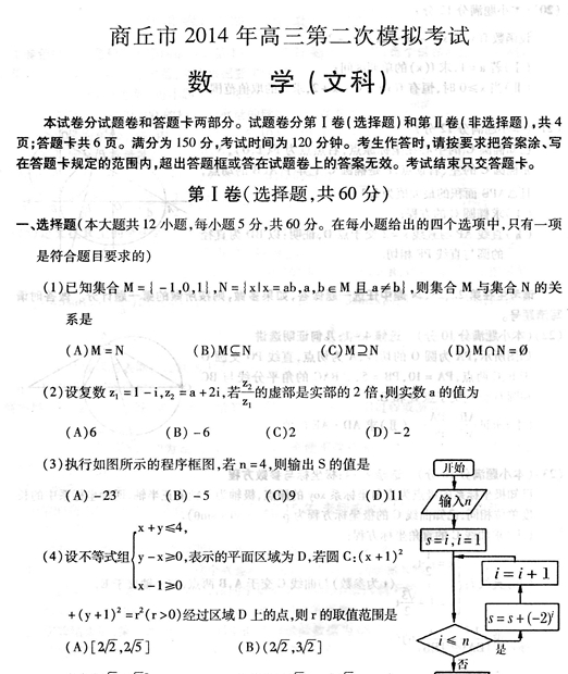 河南省商丘市2014年高三第二次模拟考试(数学文)扫描版试题Word版答案