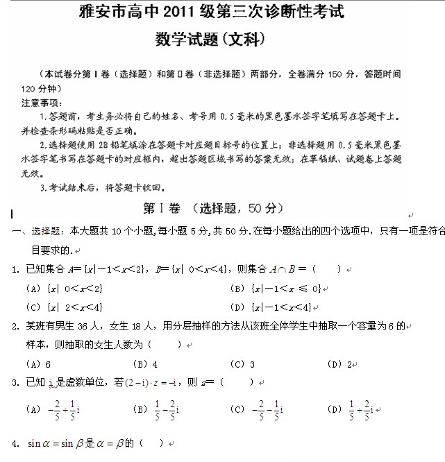 四川省雅安市2014届高三第三次诊断性考试(数学文)2014雅安三诊
