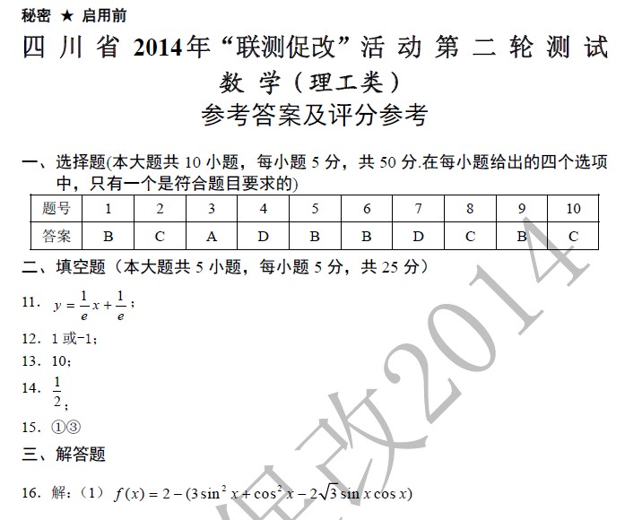 四川省2014年“联测促改”活动第二轮测试 数学理(仅参考答案)PDF版