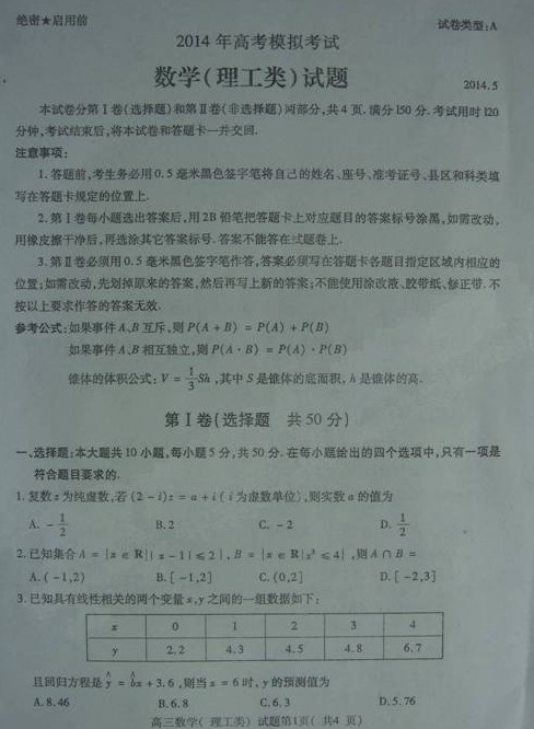【2014济宁二模】山东省济宁市2014届高三第二次模拟考试(数学理)图片版含答案