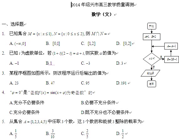 【2014绍兴一模】浙江省绍兴市2014届高三教学质量调测(数学文)