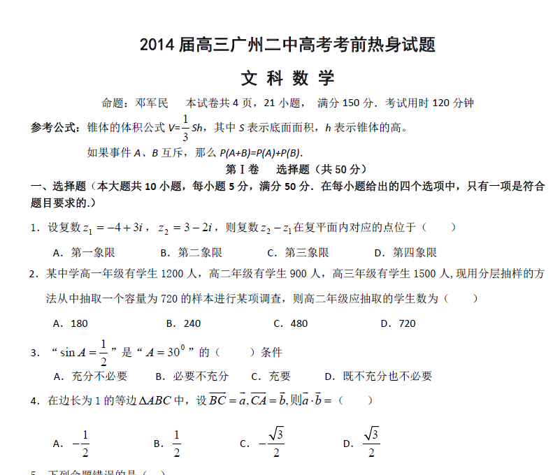 广东省广州二中2014届高考考前热身试题(二)(数学文)PDF版