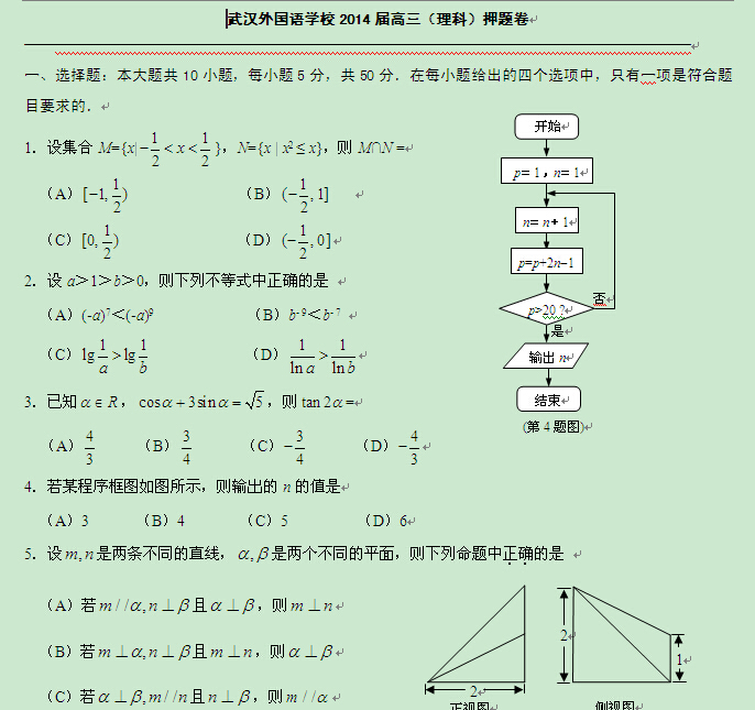湖北省武汉外国语学校2014届高三押题卷(数学理)