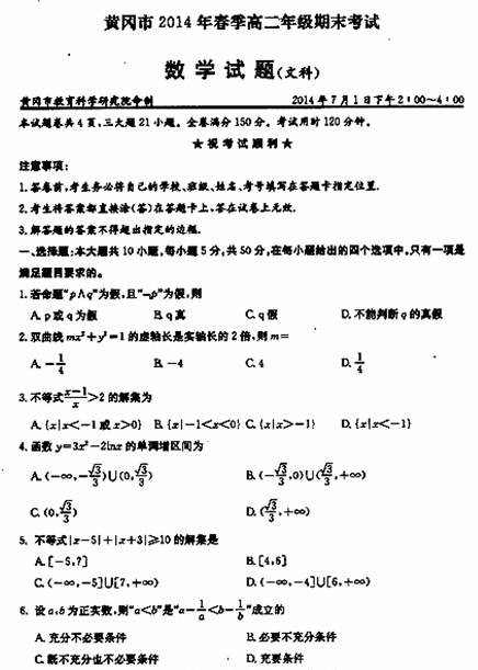 湖北省黄冈市2013-2014学年高二下学期期末调研考试(数学文)(扫描版)