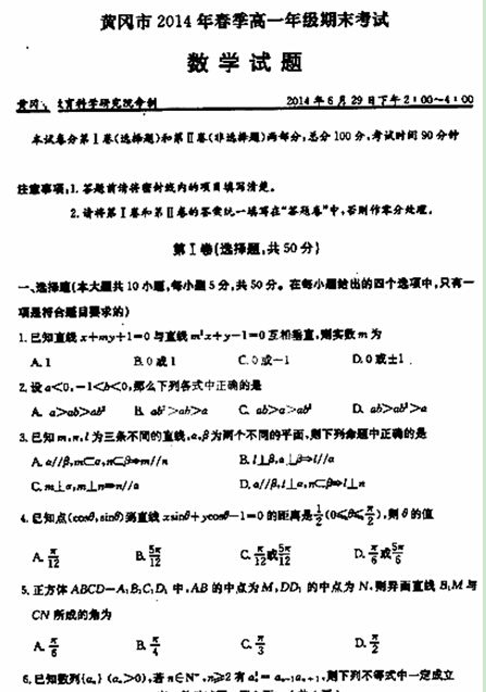 湖北省黄冈市2013-2014学年高一下学期期末调研考试(数学)(扫描版)