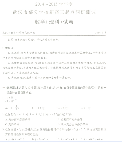 湖北省武汉市部分学校2014-2015学年高三新起点调研考试(数学理)扫描版