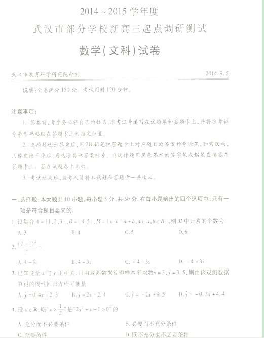 湖北省武汉市部分学校2014-2015学年高三新起点调研考试(数学文)扫描版