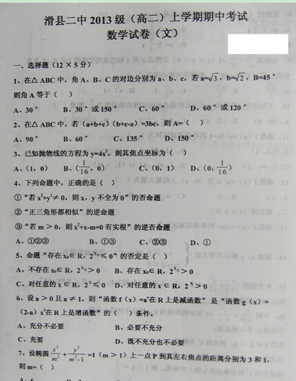 河南省滑县第二高级中学2014-2015学年高二期中考试(数学文)扫描版