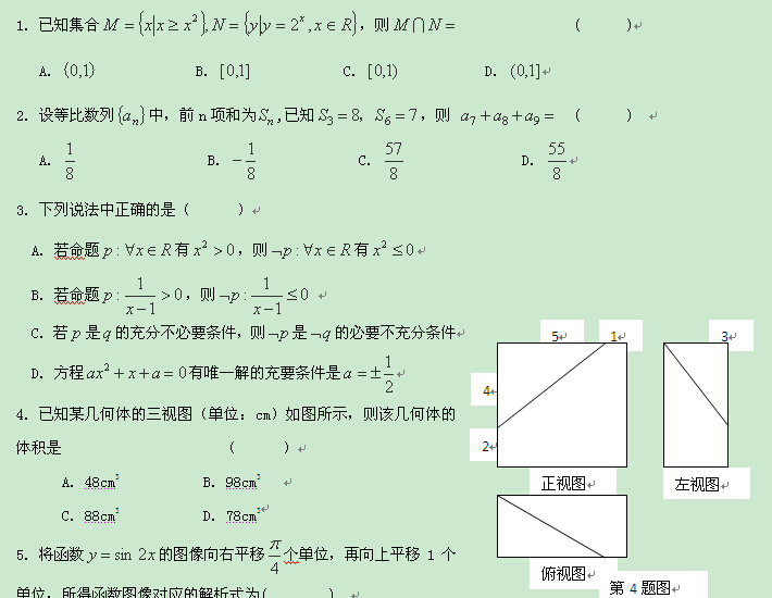 山东省枣庄市第三中学2015届高三第二次(1月)学情调查(数学文)