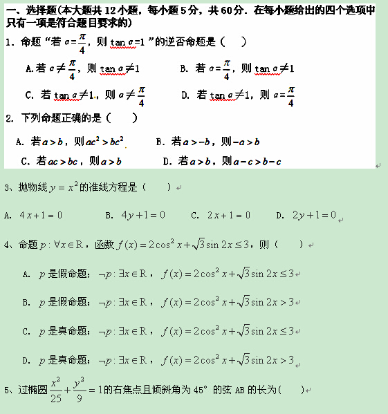 内蒙古第一机械制造集团有限公司第一中学2014-2015学年高二上学期期末考试(数学理)