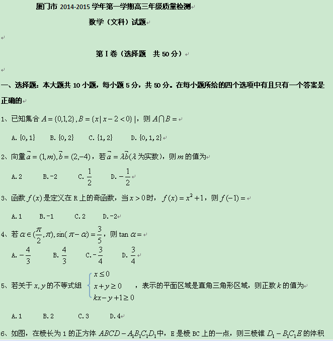 福建省厦门市2015届高三上学期期末质量检查(数学文)