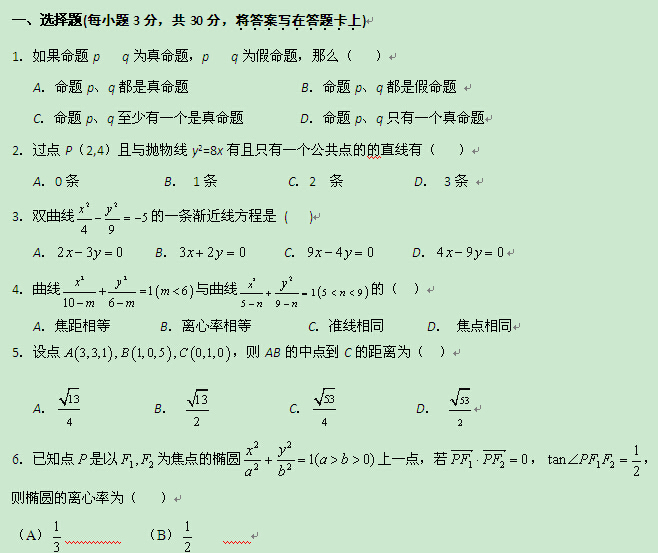 甘肃省天水市秦安县第二中学2014-2015学年高二上学期期末考试(数学理)