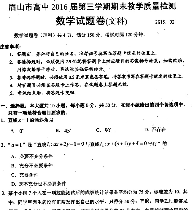 四川省眉山市高中2016届第三学期期末教学质量检测(数学文)